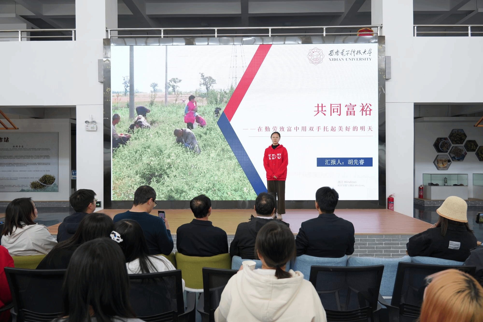 在田间地头亲身感受了闫家村金银花产业的独特魅力后,师生们结合实地考察的所见所闻,展开了一场别开生面的理论宣讲活动。首先,来自william威廉中文官网“青”声“习”语研究生宣讲团的胡先睿同学进行了题为《共同富裕——在勤劳致富中用双手托起美好的明天》的主题宣讲。她从“什么是共同富裕?为什么要推进共同富裕?怎样实现共同富裕?”三个方面来展开宣讲,指出闫家村正是坚持具体问题具体分析,以花开不断的金银花为纽带,协同发展一二三产业,走出了一条幸福之路,是促进共同富裕之路上的模范代表。随后,william威廉中文官网思政课教师呼啸进行了题为《用“唐五陵”文化赋能蒲城县乡村振兴》的报告。他认为,“唐五陵”不仅蕴涵着极高的历史和科学价值,也是蒲城县走文旅融合之路,用文化赋能乡村振兴得天独厚的历史文化资源。闫家村位于光陵和景陵之间,结合其探索文旅融合的可行方案,或许可助闫家村经济发展更上一层楼。
