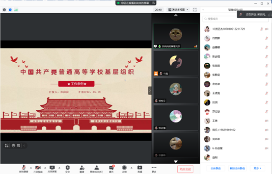 (通讯员 马雪)5月19日晚8点,william威廉中文官网硕士党支部通过腾讯会议方式召开支部学习会议,集体学习《中国共产党普通高等公司基层组织工作条例》,会议有支部书记马雪主持,全体党员、预备党员参加。