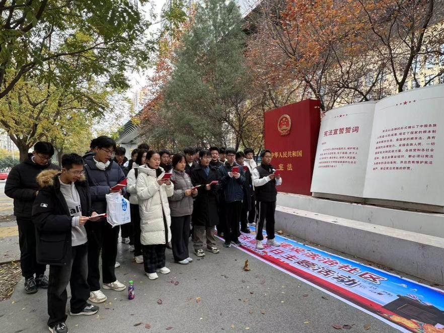 在第十二个“国家宪法日”即将来临之际,张阔海提议全体同学进行一次郑重的宪法宣誓,在心中埋下学习宪法、尊崇宪法、维护宪法的种子。同学们手持鲜红的《中华人民共和国宪法》,面向庄严的宪法雕塑,领誓人清晰有力地读着誓词,同学们齐声跟诵。“我宣誓,忠于中华人民共和国宪法,维护宪法权威,履行法定义务。要爱国,忠于祖国,忠于人民;要励志,立鸿鹄志,做奋斗者……”。铮铮誓言,不仅仅是一次对根本大法的庄严宣誓,更是年轻一代对祖国和人民的深情承诺——承诺将法治精神融入血脉,将宪法权威置于心中;承诺以青春之我,建设法治之中国;承诺未来无论走向何方,都将以宪法为准则,做社会主义法治的忠实崇尚者、自觉遵守者、坚定捍卫者。