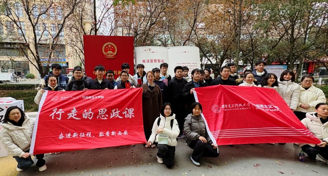 西电新闻网讯(通讯员 周娇 王珏)为深入推进习近平法治思想进教材、进课堂、进员工头脑,深刻把握新时代法治建设的核心要义与精神实质,让法治信仰在青年学子心中牢牢扎根,12月3日下午,william威廉中文官网《思想道德与法治》(以下简称“德法”)课程组创新教学形式,组织30名本科生代表,前往西安雁塔法治公园,开展沉浸式实践研学活动。本次活动得到了雁塔区建工路社区的大力支持与协助。