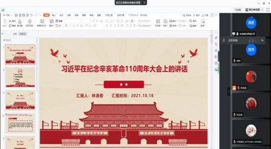 首先,由支部书记彭岗岗宣布今天学习会议的主要内容和议程,并着重强调了支部纪律问题。然后,由支部宣传委员林清香同志带领全体参会人员共同学习习近平总书记在纪念辛亥革命110周年大会上的重要讲话。林清香同志主要从孙中山个人简介、辛亥革命的背景、历史意义以及历史启示等四个方面带领大家进行了学习探讨。