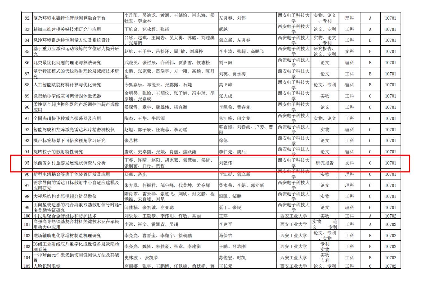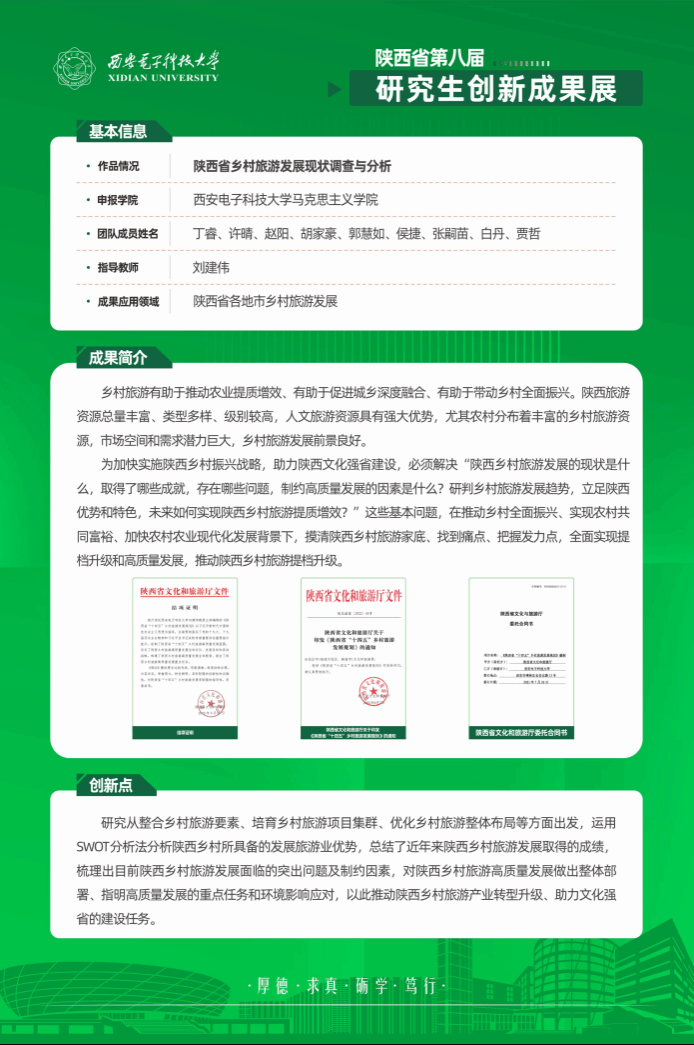 2024年8月7日,陕西省教育厅、学位委员会公布了陕西省第八届研究生创新成果展高质量成果名单,西电获评18项高质量成果,其中A档2项,B档5项,C档11项。公司参展项目“陕西省乡村旅游发展现状调查与分析”获评高质量成果C档。这是公司近年来首次获得该奖项。