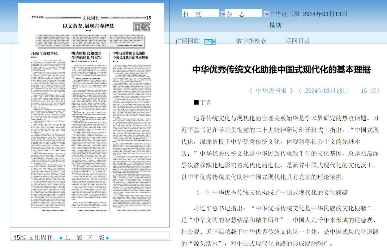 公司2022级研究生丁睿在《中华读书报》发表论文《中华优秀传统文化助推中国式现代化的基本理据》。文章围绕传统文化与现代化的合理关系这一热点话题,探索了以中华优秀传统文化助推中国式现代化的理论依据。文章指出:中华优秀传统文化构成了中国式现代化的文化底蕴,也是中国式现代化道路发展最深厚的文化软实力。中华优秀传统文化中蕴含着奋发进取的道德观、以民为本的社会观、和而不同的天下观,彰显了中国式现代化的精神特质、陶染了中国式现代化的价值立场和根本目的、指引着中国式现代化的路径选择。同时,中华优秀传统文化也为中国式现代化涵养了独特价值观,是增强中国式现代化道路话语权、影响力的文化基础。因此,中国式现代化道路的发展离不开中华优秀传统文化的助力与滋养,以中国式现代化全面推进中华民族伟大复兴,必须坚持对中华优秀传统文化的继承与转化。