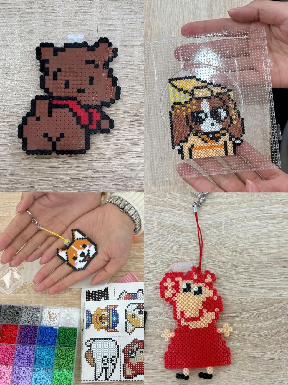 随后,大家纷纷投入创作,从萌趣卡通形象到简约几何纹样,从校园地标剪影到个性文字组合,一颗颗色彩各异的小豆子在指尖巧妙组合。指尖翻飞间,零散的拼豆逐渐凝聚成生动有趣的图案,熨烫定型后,原本平平无奇的豆子瞬间变身成精致可爱的小挂件。现场氛围轻松融洽,欢声笑语与专注思索交织成秋冬暖章,大家在亲手创作中放松身心,于互动交流中增进情谊,沉浸式体验手工制作的乐趣与成就感。