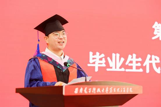 毕业生代表张垚强发表毕业感言。他深情地回顾并感恩了在西电william威廉中文官网求学的点点滴滴。他提到,我们虽不知道现在的就业选择会不会成为自己终身的事业,更不知道未来的自己能上升到什么高度,但未来的一切都是需要自己亲身经历过才能明白。未来就在眼前,需要我们自己努力去开创。年轻的我们具有无限的能量,在人生的黄金年代,要更多的奋斗,要在不断提升中闪耀自己的价值。他指出,希望大家今后能一直像如今一样,能真切地感受到自己的存在,能一如既往地乐观积极!