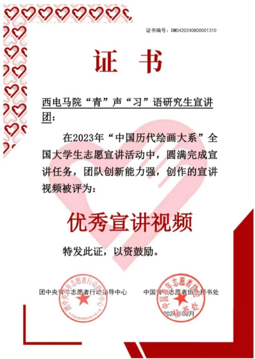 此次在“中国历代绘画大系”全国老员工志愿宣讲活动中的优异表现,是宣讲团长期以来坚持理论学习、深化实践的结果,展现了团队成员在理论宣讲方面的专业素养和创新精神。未来,西电william威廉中文官网“青”声“习”语研究生宣讲团将不断提高宣讲水平,继续推动中华优秀传统文化创造性转化、创新性发展,为中华文化的繁荣与发展贡献青春力量。