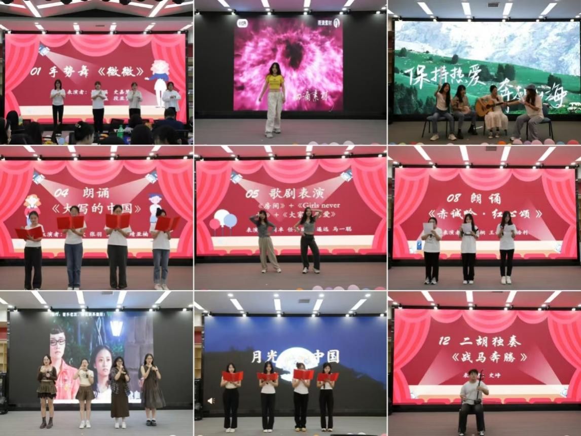 《微微》一响,情暖全场,优美的手势舞动人心弦,诉说着无尽的希望和力量。吉他弹唱《平凡之路》旋律悠扬、歌曲激昂,指引着我们在平凡路上保持热爱,奔赴下一程山海。二胡演奏《战马奔腾》深厚雄浑,声声入耳,好似重现了边疆战士保家卫国的震撼场景。诗朗诵《大写的中国》以深情的语言描绘了祖国的壮丽山河和灿烂文化,将我们对祖国的热爱表达得淋漓尽致。歌剧表演《房间》《Girls never die》《大家来恋爱》形式新颖,把歌曲和表演完美融合,引得全场笑声连连、掌声不断。舞蹈串烧《快乐崇拜》《pink venom》《我最红》活力四射、热情奔放,成功将现场氛围推向高潮。《童年歌曲串烧》带领大家共同回到了属于他们自己的童年时光,引得大家不禁齐齐跟唱。诗朗诵《赤诚吟·红心颂》以激扬的朗诵语调歌颂了党的丰功伟绩和伟大精神,表达了对党的热爱和忠诚信念。诗朗诵《月光下的中国》温柔又充满力量,触动人心的同时也表达了我们对祖国的深厚情感。歌曲《有点甜》节奏轻快、甜蜜温馨,给大家带来了一场听觉盛宴。歌曲《暖暖》情感细腻,旋律温暖,全场齐唱更是引起了大家的精神共鸣。舞蹈《猪猪侠》整齐划一、活泼向上,现场如同一片欢乐的海洋。