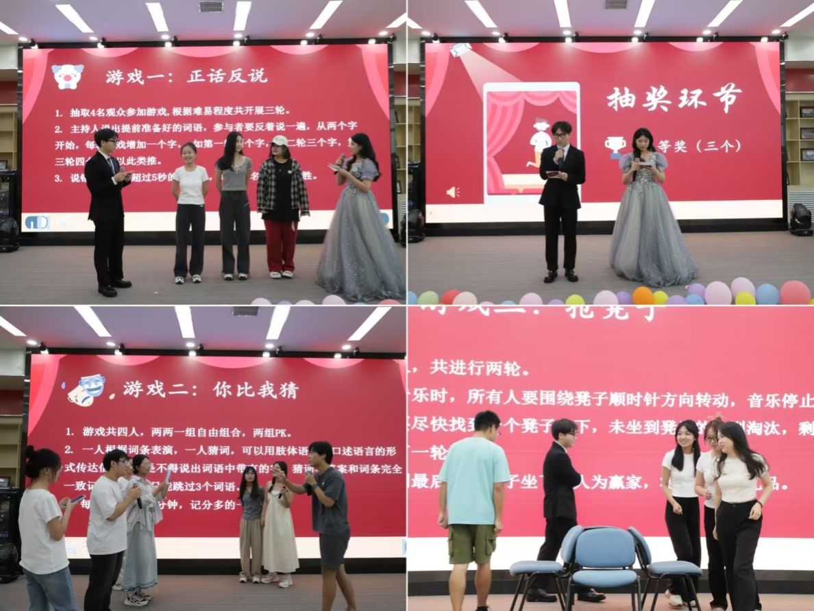 除了精彩绝伦的表演,活动还设置了很多有趣的游戏环节,比如正话反说、你画我猜、抢凳子和现场抽奖等。这不仅增添了活动的趣味性,还进一步拉近了大家之间的距离,提升了同学们之间的互动性和合作精神,现场的活动氛围也因此更加热烈和活跃。
