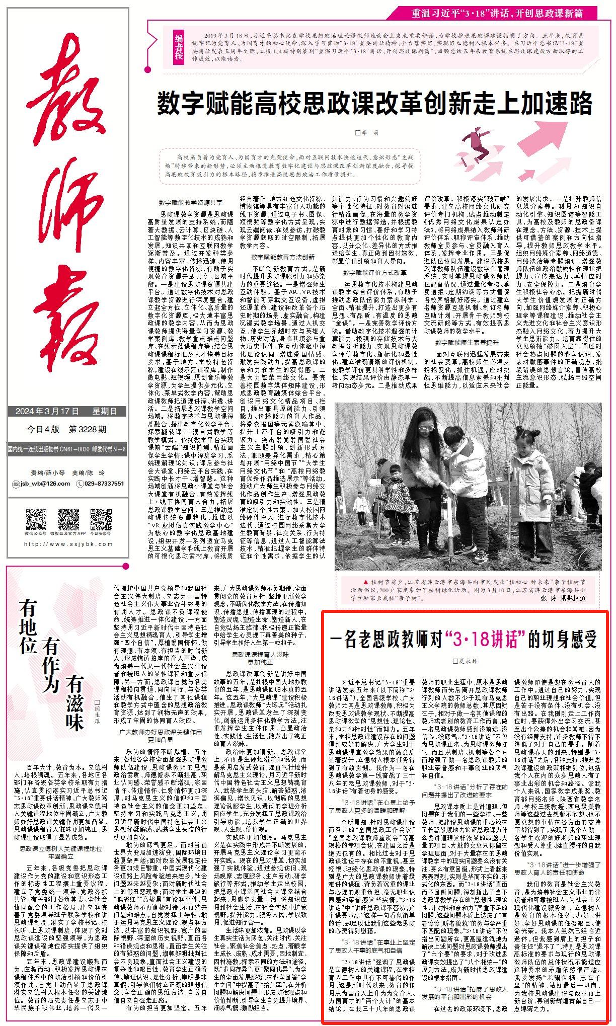 在过去的政策环境下,思政课教师即使是想在教书育人的工作中,通过自己的努力,能够实现自己的职业理想和社会价值,但是苦于没有条件、没有机会、没有出路。在我个人刚刚走上工作岗位之后,那个时候,要获得外出学习交流、甚至出个公差的机会非常难,因为没有经费支持,许多的教师不得不降低了对于自己的要求。随着思政课的春天到来,特别是“3.18”讲话之后,各种支持、推进思政课建设的政策相继到位、甚至是超量的支持,包括我个人在内的众多的思政课人有了事业出彩的机会和路径。拿我个人来说,国家教学成果奖、教育部网络名师、陕西省教学名师、公司三级教授、西电最美教师等等这些过去想的不敢想、也不愿意想的事情在各方面的支持下都得到了,实现了我个人做一名员工欢迎的好老师的职业理想和受人尊重、挺直腰杆的自我价值为实现。没有“3.18”讲话及后来的系列政策,一切都是不可能的。