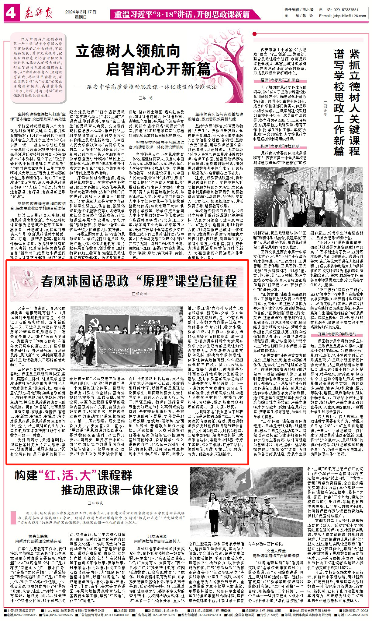 又是一年春来到。春风沐园话思政,培根铸魂育新人。3月18日对于思政教师而言注定是一个铭记于心的历史时刻。五年前的这一天,习近平总书记在北京主持召开公司思想政治理论课教师座谈会并发表重要讲话,讲话高屋建瓴,内涵丰富,精辟透彻,从党和国家事业发展的全局展开,从夯实意识形态领导权的高度着眼,从全面建设中国特色社会主义的广度出发,强调了思想政治教育工作的基础性、重要性、必要性、紧迫性,界定了思想政治理论课的根本任务和战略地位,对新时期思政课教师提出了高定位、高标准、高期望、高要求。“思政课是落实‘立德树人’根本任务的关键课程”,如何“永葆为党育人、为国育才的初心使命”,在百年大变局的历史境遇中,一切向新出发,在新学期开启新征程、开出新气象、谋划新思路、 展现新作为,共绘新愿景是思政课教师义不容辞的使命。