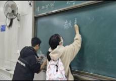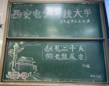 整个微视频展示课从组织、主持、设计、评委、板报、摄影等全部由员工们承担。因为课程是在上午34节进行,负责黑板报的夏志颖同学一下课就奔向该教室,另一位负责写字的马蕾同学连书包都没顾上放下就拿起粉笔,眼看时间不多了,另三位女生也奔到讲台一起帮忙。负责拍摄的杨墨墨同学迅速拍下这些动人精彩瞬间,课代表胡海洲同学随后组建团队创作出德法30班微视频展示课的微视频作品。