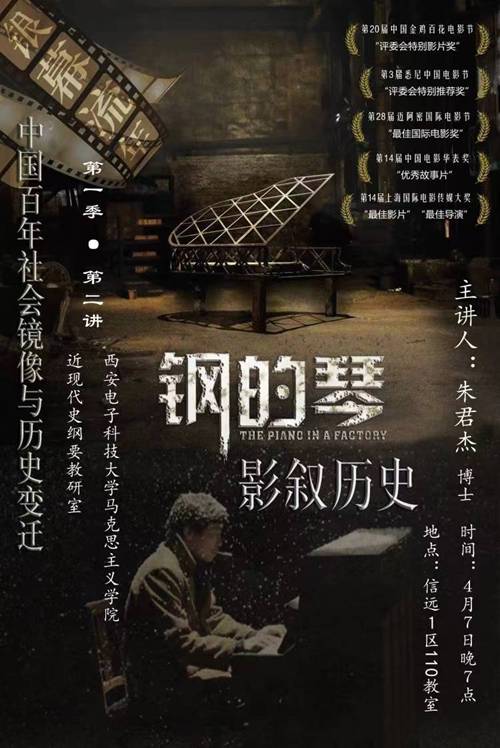 (通讯员 朱君杰)由中国近现代史纲要教研室所举办的《银幕流年:中国百年社会镜像与历史变迁》的主题观影系列活动第二期,于47日晚19:00,在信远楼I110教室举行。本次观影活动选择的主题电影为张猛导演指导的《钢的琴》。主讲教师仍为朱君杰。