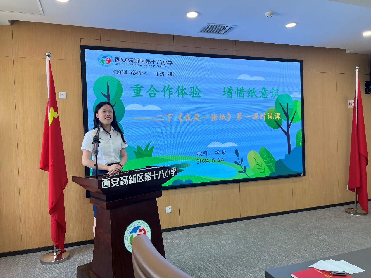 随后,高校区第十八小学敬荣老师就二年级下册《道德与法治》中“重合作体验 增惜纸意识”一节进行了说课。两校教教师围绕说课内容,就不同学段内容衔接、知识体系向价值体系转化、教材语言向教学语言转换、拔高总结等进行了热烈讨论,进一步加深了对大中小学思政教育一体化建设的理解,双方就常态化开展交流和联合备课达成高度共识。